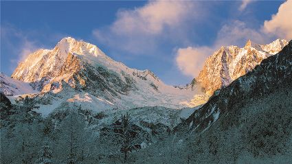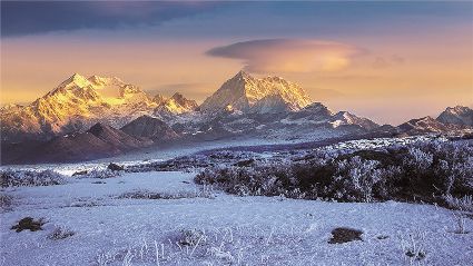 在一片片雪花的飄落中,冬天來了,它帶著風、帶著雪,帶著讓人不禁要裹緊衣服的寒冷來了,萬物在冬的腳步中慢慢俯下身子貼緊了大地。蕭索、蒼涼、千里冰封、萬里雪飄……在這些形容冬天的詞語里,我們看到的是只有黑白兩色的畫面,黑的是物,白的是雪。但是,在甘孜州,冬天卻是色彩繽紛的,不僅有白的雪,還有藍的天、綠的水、黃的樹、紅的葉……還有炊煙升起的藏寨、水汽氤氳的溫泉和日照金山的美麗景致。