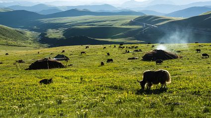 云海伴隨著太陽光升起,籠罩在山間草原上,久久不能散去,朦朦朧朧、清新淡雅。