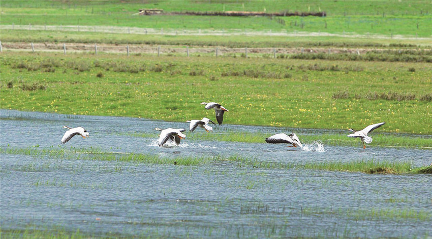 拉龍措古冰漂濕地旅游景區(qū)里有近百種植被,以及黑頸鶴、黑鸛、金雕、胡兀鷲等鳥(niǎo)類動(dòng)物。陽(yáng)光下的拉龍措,波光粼粼,斑頭雁在湖面“飛舞”,潔白的羽毛伸展后露出圍繞的黑邊,宛若芭蕾舞者在湖面起舞……