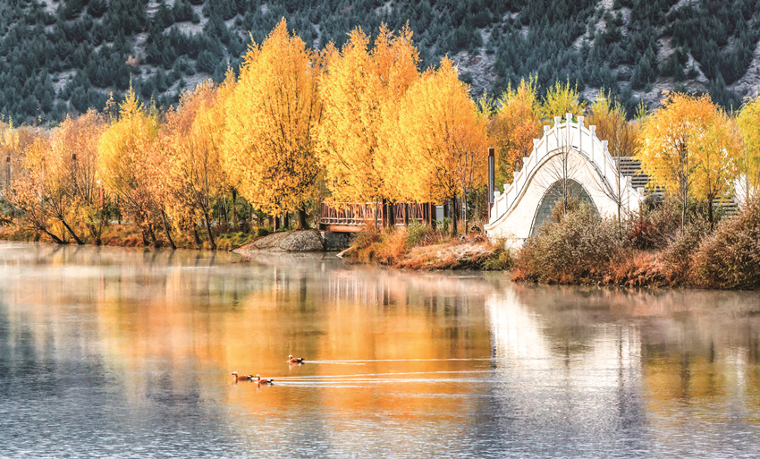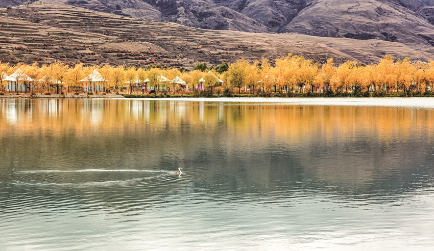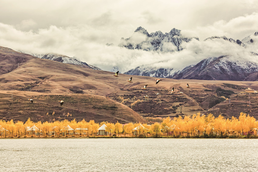 除了巍峨的雪山與彩林作伴,不少越冬的候鳥也飛抵珠牡湖。金色彩林倒映在清澈如鏡的湖面上,不時有候鳥游過,激起層層漣漪,為珠牡湖增添了不少生機與趣味。