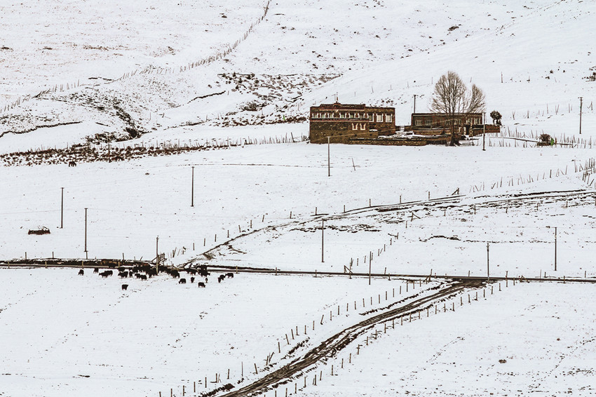 雪后的高原,藍(lán)天白云,大地和連綿到天邊的遠(yuǎn)山,就像被什么過濾了一樣,一片潔白,滿眼凈是純凈的美,全然沒有冬日的荒涼,更顯空靈、大氣,盡顯高原獨(dú)特的美。白雪覆蓋的村莊、牧場(chǎng)被河流、大路小徑串連起來,寧?kù)o、秀美,像一幅幅天然的水墨畫,美不勝收。