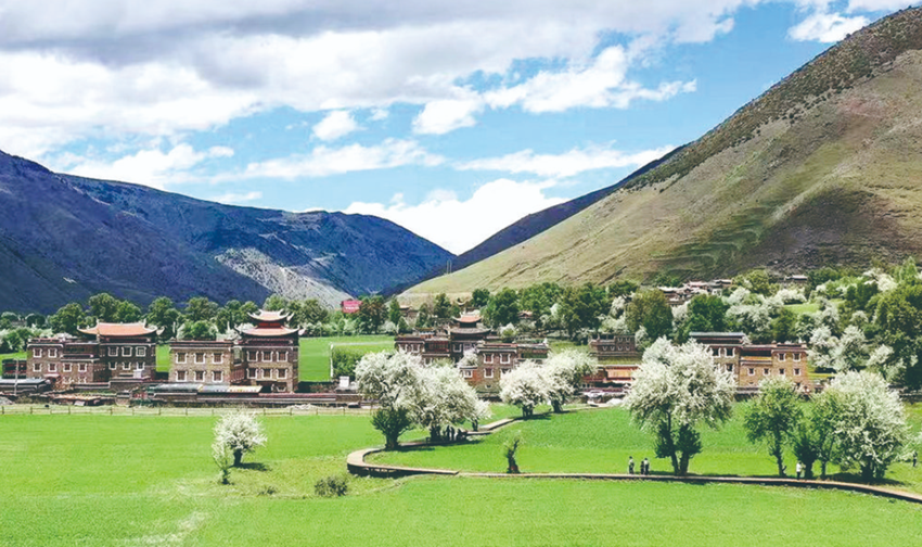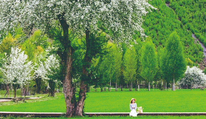 每年5月下旬,貢嘎海棠盛放的甲根壩就瞬間變身為秀美的世外莊園,木雅藏房錯落有致,青稞麥田綠意蔥蘢,潔白的花朵成簇成團(tuán),溫暖漫山遍野,微風(fēng)輕拂,花落成雪,飄滿碧空如洗的天空,花兒灑在田間、落在地頭,在藍(lán)色的天空、棕色土壤和青綠色樹葉映襯下,顯得清新至極。