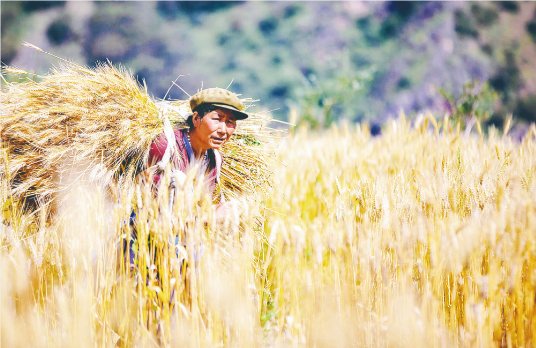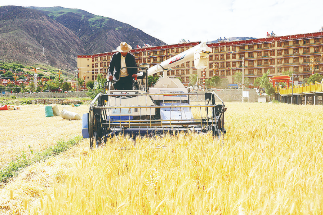 我州各地青稞、小麥陸續(xù)進(jìn)入成熟期,眼下正值“雙搶”關(guān)鍵期。放眼望去,在廣袤的田野上,一片熱火朝天的繁忙景象。村民們頭頂烈日,腳踏泥土,緊張而有序地投入到“雙搶”工作中。新型農(nóng)具為“雙搶”注入強(qiáng)大動力,收割機(jī)在田間往來穿梭,一顆顆飽滿的麥粒從倉門傾瀉而下,源源不斷地被送上拖拉機(jī),將成熟的小麥、青稞迅速收割歸倉,展現(xiàn)出一幅喜慶熱鬧的豐收畫卷。