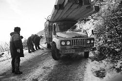 一九九七年十一月二十四日,連續(xù)多日大雪,把整個二郎山裹得嚴嚴實實,白茫茫一片。陣陣山風吹過,大霧就像瀑布一樣,從山頂直往下翻涌傾瀉。 一大早,州交通局打冰除雪排險的干部職工就從二郎山管理站直奔山埡口。載有防滑砂的大貨車穿迷霧,繞山梁,向山頂埡口疾馳。由于氣溫太低,霧又大,車上的擋風玻璃很快就結(jié)下了冰,路面打滑非常嚴重。前面車輛堵了起來,排險人員只好下車步行。 大霧彌漫,能見度很底,陰霾的天空又飄起了紛紛揚揚的雪花,剌骨的寒風陣陣襲來,只聽見車蓬布在風中“嗶剝”作響,卻看不見前面到底堵了多少車。排險人員只好相互攙扶踩著冰滑的邊路艱難地向行。好不容易來到堵在最前面的車子面前。原來是一輛載著原木的東風牌大貨車側(cè)滑在公路上,把整個公路堵死了。 局領(lǐng)導(dǎo)當即指揮大家用鋼釬、鐵鎬和鋤頭處理冰道,沒有撮箕,大家借來加水桶裝運冰雪……氣溫仍在急劇下降,剛從雪堆里刨出來的路,又被結(jié)起一層冰,就像地面上澆上了油,這就是冰雪道上有名的“桐油凌”。 有二位老同志不顧年老體弱,積極參與打冰除雪,一個在打冰時,被彈起的冰碴把腦門劃了一個口子,鮮血直往外冒。有人想幫他包扎,他堅決不干,自己就用手帕按住,把帽子向下拉蓋住傷口就算了。血從手帕中浸透出來,與眉毛上的冰凌結(jié)在一起。氣溫太低,冰層太厚,十字鎬每挖一下,多數(shù)情況下也就是挖下一個白點而已。不一會兒,另一位老同志已是滿頭大汗,大家勸他休息一下,他卻說:趁著現(xiàn)在雪不是太大,早點把主道上的冰雪多除點,過往二郎山的車輛就多一份安全。 排險人員的手凍紅了,刨冰雪碰傷的指頭還流著鮮血,身上蒸發(fā)的熱氣,把衣領(lǐng)口、袖子口和褲子口結(jié)成了冰,可是,誰也沒有吭一聲。 ……受堵車輛終于向前開動了。 風,越刮越猛,雪,越來越大。 防滑車在冰雪道上艱難地向前爬行著,車箱上面的職工們揮舞的洋鏟向路面撒著防滑砂。一路上風絞雪,防滑車象一頭不聽使喚的牛,顛簸、亂竄,好不容易才來到260(二郎山最險處),對這里“桐油凌”路面進行重點防滑處理后,防滑車又返回來,開始向山頂進發(fā)……風雪二郎山上打冰除雪、防滑排險,看似沒有驚天動地的壯舉,身臨其景才知其艱難辛苦。難怪當年每每經(jīng)過二郎山冰天雪地奇險路段的車,都會向風雪中屹立路邊的交通系統(tǒng)排險保暢通的職工們鳴笛致敬,風雪中的那份情彌足珍貴。 川藏線上的老司機傳下來一首傷心的順口溜:“車過二郎山,如闖鬼門關(guān),萬幸不翻車,也要凍三天!”其險峻實為罕見,尤其是途經(jīng)二郎山260(公路公樁)處,曾被淡虎色變的人稱為“鬼招手”的險路段。 1983年1月3日,有著安全行車44萬公里記錄的一位駕駛員開著輛嶄新的東風牌貨車,同行還有兩名職工,夜行二郎山,在彌天大霧中神秘地“失蹤”了。十五天后,搜山的人才用望遠鏡看到260公里路樁處的山崖下,有一塊汽車破篷布掛在樹枝,猶如招魂的凄厲幌幡在冷風中招搖晃動。鋼纜繩吊著搜山的人下到崖下400米深處的谷底。扒開一座座雪堆,叫人汗毛倒豎:雪堆下,盡是廢大梁、爛車廂、銹車頭和支離破碎的汽車,足有一個汽車連!一輛不知埋了多久的卡車廂里牛肉已腐爛,駕駛室里坐著三具發(fā)黑的僵尸……其狀慘不忍睹!