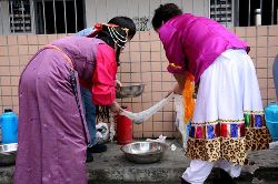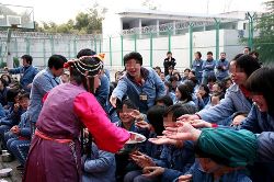 3月4日是藏歷木馬年正月初三,成都女子監(jiān)獄的藏族服刑人員穿戴起節(jié)日的盛裝,和走入高墻的西南民院師生們共度藏歷新年。篝火熊熊,歡樂(lè)的鍋莊,服刑人員、民警、師生們一同舞蹈,一同歡笑。