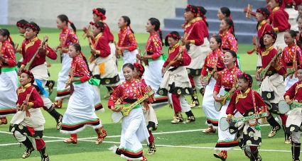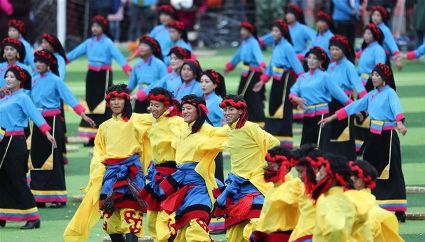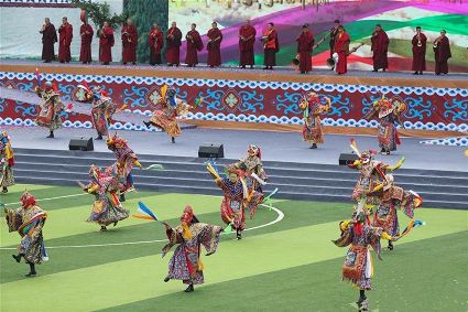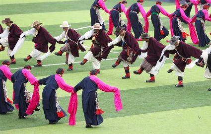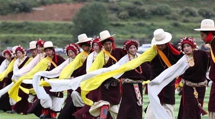 7月29日,來自四川省道孚縣各地的上萬名藏族群眾在道孚中學載歌載舞,歡慶第三屆安巴農耕文化旅游節(jié)。安巴在藏語中是五月的意思,藏歷五月正值農閑時期,藏族群眾都會舉行各種活動,祈禱風調雨順,吉祥平安。