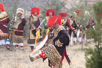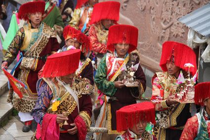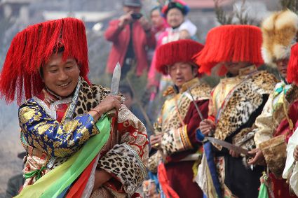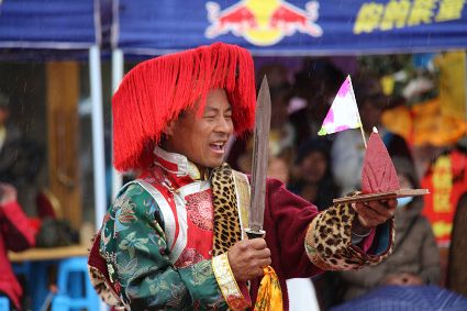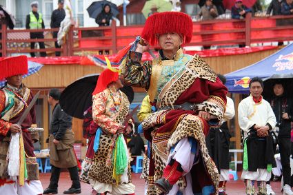 除了歌舞文化,德欽還是民俗文化最大的平臺,神山祭祀是村村寨寨必不可少的活動,在德欽,藏民對山水自然賦予了靈性,認為自然也是和人一樣有著生命和靈性,尊重自然演繹出神山祭祀活動豐富多彩?!暗顿潯?藏語稱“百諧”。在德欽農(nóng)村,刀贊是祭祀活動的重頭戲,這一天,不亞于一個盛大的服飾表演。相傳“百諧”是古時村民為消除戰(zhàn)亂,祈福平安的一項傳統(tǒng)祭祀活動,延續(xù)至今已經(jīng)成為一項傳統(tǒng)的民俗活動?!鞍僦C”既是祭祀活動的一個儀式,也是一個獨立的傳統(tǒng)民俗活動,村里每戶一男丁在這一天必須參加“百諧”?!疤K夏”是村里男人戴的最為隆重的帽子,他不同于金邊帽和狐皮帽。長刀是“刀贊”的道具, “吉祥的日子里,我們一敬天地,賜給我們帶來幸福的生活;再敬尊敬的共產(chǎn)黨,為我們帶來平安吉祥;三敬慈祥的雙親,教會我們?nèi)绾巫鲆粋€好人……”朗朗上口的說詞伴著閃閃的刀光起舞,頗具康巴壯士的英武陽剛。