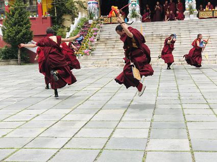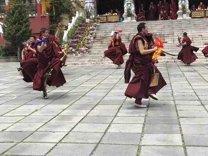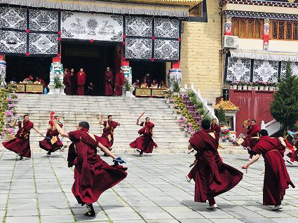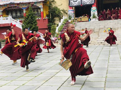 跳神儀式開始,南無寺內(nèi)鼓號齊鳴,喇嘛身著顯耀盛裝,點燃新綠松枝,幾縷藍(lán)色煙紋升起。一支由法鼓、鈸、海螺、法號等組成的寺廟樂隊自大殿而出,順時針繞場一周落座場邊,群神出場繞圈而舞,以示凈化場地,祈請諸神入位。接著,象征護(hù)法神舞、骷髏舞、鹿神舞、黑帽咒師舞和金剛力士舞的演員手持各類法器挨個入場手舞足蹈。舞蹈的起落根 據(jù)場邊奏響的器樂節(jié)奏進(jìn)行。最后由眾神驅(qū)鬼逐邪,押送“朵馬”(由糌粑捏成用以供神施鬼的食品)至寺外拋丟焚燒,以示驅(qū)逐一年的邪魔,祈禱來年安樂。