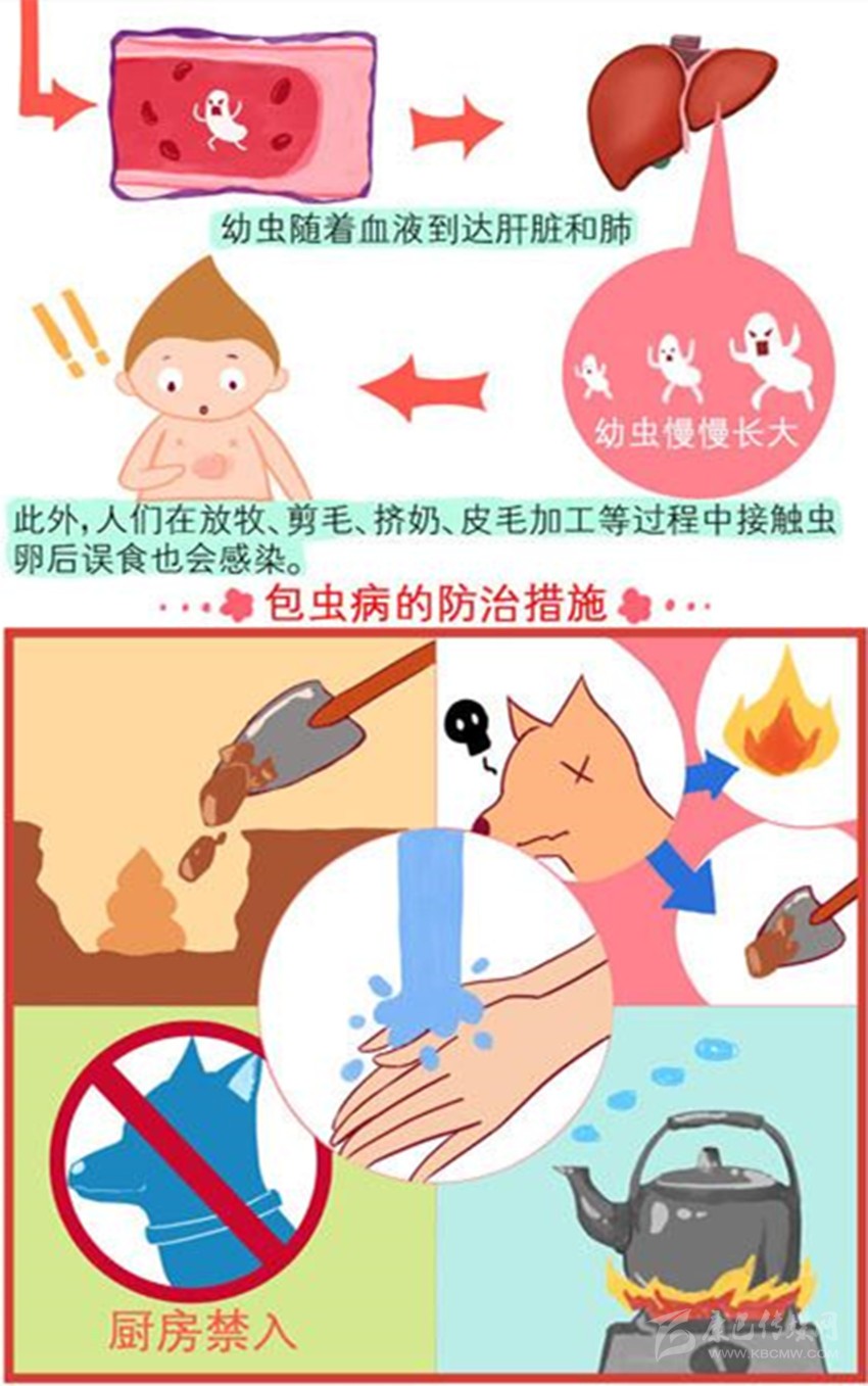 我們先看包蟲(chóng)病的發(fā)生過(guò)程:狗、狼、狐貍等食肉動(dòng)物食入感染棘球幼蟲(chóng)(棘球蚴囊里可會(huì)有數(shù)百萬(wàn)個(gè)棘球幼蟲(chóng))的羊、牛、豬、馬、鹿、兔、鼠的生內(nèi)臟或未熟的肉類后,棘球幼蟲(chóng)在它們小腸腸壁隱窩內(nèi),經(jīng)7-8周生長(zhǎng),發(fā)育成為米粒大小的成蟲(chóng)——棘球絳蟲(chóng)。成蟲(chóng)有頭、頸、體節(jié),體節(jié)中有成節(jié)和孕節(jié),成蟲(chóng)無(wú)雌雄之分,屬于雌雄同體,每隔7-14天蟲(chóng)卵形成,孕節(jié)脫落隨糞便中排出,成節(jié)再發(fā)育為孕節(jié);同時(shí),成蟲(chóng)還可自然下滑其肛門(mén)引起肛門(mén)發(fā)癢,這時(shí)狗、狼、狐貍等回頭用舌舔、牙咬,孕節(jié)被壓碎,蟲(chóng)卵排出。脫落的孕節(jié)可沿草地或植物蠕動(dòng)爬行,孕節(jié)邊走邊下蛋,導(dǎo)致蟲(chóng)卵四處擴(kuò)撒。蟲(chóng)卵細(xì)小,肉眼看不見(jiàn),它在干燥環(huán)境中能存活11-12天,在2℃水中能活2.5年,在冰中可活4個(gè)月。就是這樣蟲(chóng)卵它引起狗自身和與其接觸的羊、牛、豬、馬等家畜的皮毛污染外,它還隨著狗、狼、狐貍等活動(dòng)場(chǎng)所不同污染牧場(chǎng)、畜舍、蔬菜、土壤及水源等環(huán)境;毫無(wú)警惕,多而細(xì)小的蟲(chóng)卵它們易被人和羊、牛、豬、馬、鹿、兔、鼠等草食動(dòng)物誤食吞下,吞食的蟲(chóng)卵它們很快在機(jī)體的腸內(nèi)孵出變?yōu)橛紫x(chóng),幼蟲(chóng)鉆入腸壁,隨血循環(huán)到達(dá)我們和羊、牛、豬、馬、鹿、兔、鼠等草食動(dòng)物的肝、肺、腦、心、腎等器官居住下來(lái),緩慢生長(zhǎng),引起對(duì)應(yīng)部位的包囊蟲(chóng)(又稱棘球蚴),出現(xiàn)包蟲(chóng)病。包蟲(chóng)病嚴(yán)重程度取決于包囊蟲(chóng)的體積、數(shù)量、寄生時(shí)間、部位和繼發(fā)反應(yīng),而危害人畜健康和生命安全。