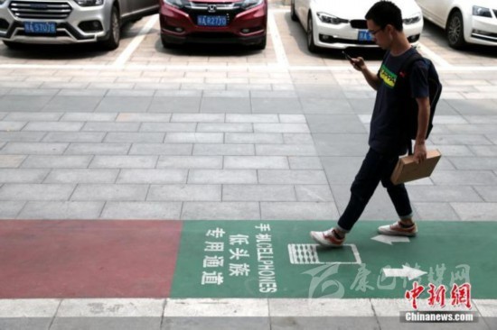 資料圖:西安街頭出現(xiàn)一條專為“低頭族”設(shè)計的通道。中新社記者 張遠(yuǎn) 攝
