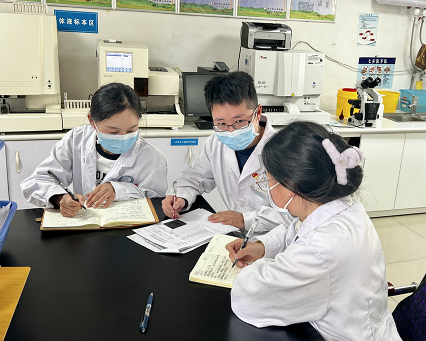 圖為幫扶工作人員正在給色達(dá)縣人民醫(yī)院檢驗(yàn)科工作人員傳授檢驗(yàn)技能。
