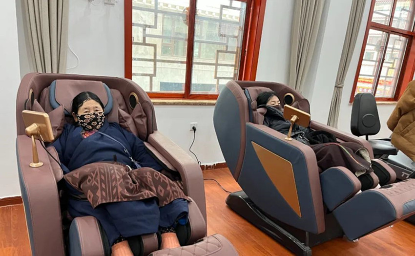 圖為老人們正坐在按摩沙發(fā)上,一邊按摩一邊聊天。