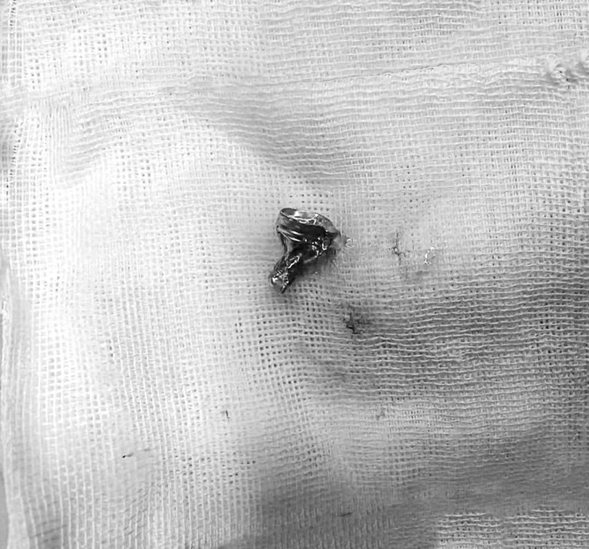 手術于1月5日13時開始,在醫(yī)院呼吸與重癥醫(yī)學科、消化胃腸鏡室的支持下,兒科與麻醉科醫(yī)護人員密切合作,兒科醫(yī)生劉勤、張雪瓊冷靜操作、沉穩(wěn)手術,最終將異物成功取出。經(jīng)仔細檢查,異物為一扭曲變形的鉛筆頭鋁箍。