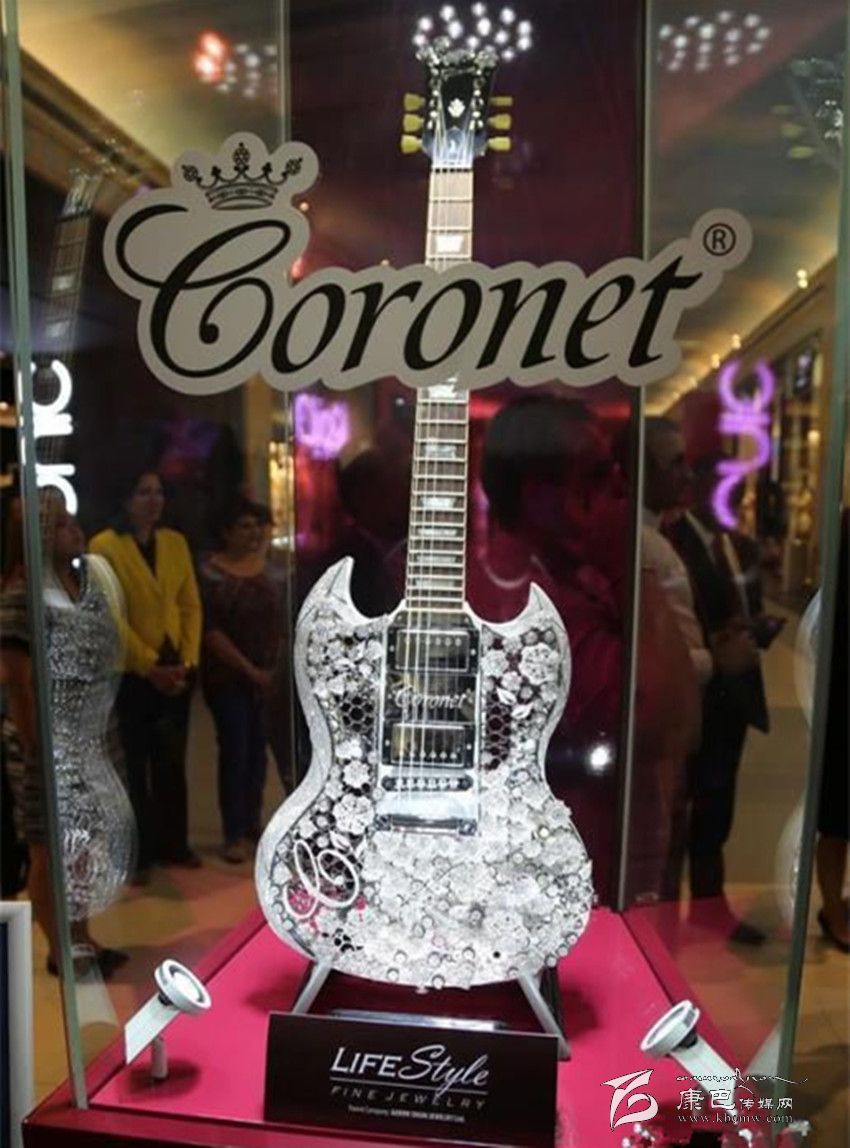這件鉆石吉他由中國香港著名音樂人雷頌德設計,周大福珠寶公司與吉布森吉他公司合作出品,用400克拉鉆石和1.6公斤黃金鑲嵌打造而成,總價值達200萬美元(約合1300萬元人民幣)。