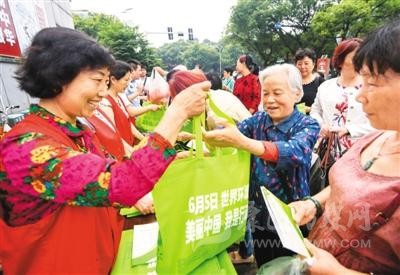 6月4日,江西省新余市渝水區(qū)城北街道辦的志愿者在恭惠農(nóng)貿(mào)市場門口向群眾免費(fèi)發(fā)放環(huán)保袋。周亮 攝