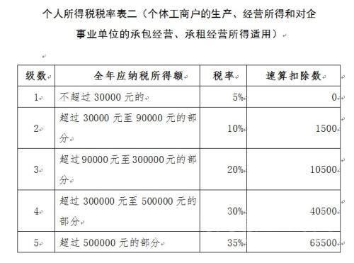 個(gè)人所得稅稅率表二(個(gè)體工商戶的生產(chǎn)、經(jīng)營(yíng)所得和對(duì)企事業(yè)單位的承包經(jīng)營(yíng)、承租經(jīng)營(yíng)所得適用)