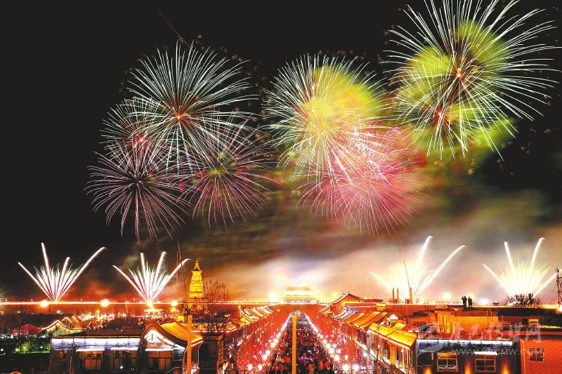 2月9日,在河北正定古城南城門上空,璀璨的電子煙花給人們帶來一道視覺盛宴。 新華社發(fā)