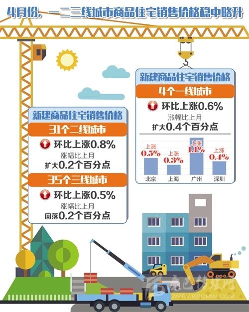 國(guó)家統(tǒng)計(jì)局城市司高級(jí)統(tǒng)計(jì)師劉建偉表示,4月份一線城市新建商品住宅和二手住宅銷售價(jià)格環(huán)比漲幅均略有擴(kuò)大;二線城市新建商品住宅銷售價(jià)格漲幅擴(kuò)大,二手住宅漲幅回落;三線城市新建商品住宅銷售價(jià)格漲幅回落,二手住宅漲幅微升。