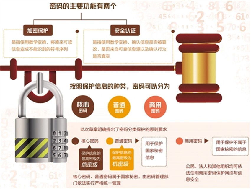 國家密碼管理局局長李兆宗作草案說明時說,密碼工作是黨和國家的一項特殊重要工作,直接關系國家安全。密碼在我國革命、建設、改革各個歷史時期,都發(fā)揮了不可替代的重要作用。進入新時代,密碼工作面臨著新的機遇和挑戰(zhàn),擔負著更加繁重的保障和管理任務,制定一部密碼領域綜合性、基礎性法律,十分必要。