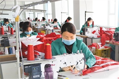 近期,甘肅省平?jīng)鍪徐o寧縣在做好疫情防控工作的同時,積極推動縣內(nèi)扶貧車間復(fù)工復(fù)產(chǎn)。截至目前,全縣57家扶貧車間已有39家恢復(fù)生產(chǎn),吸納帶動了536名貧困群眾在家門口就業(yè),增收致富。圖為靜寧縣城關(guān)鎮(zhèn)的村民在當?shù)匾患曳鲐氒囬g縫制衣服。王 毅攝(人民視覺)
