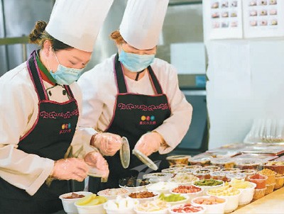 近日,重慶通過線上點(diǎn)單、“零接觸”配送等方式,讓老百姓在家里也能吃上熱騰騰的火鍋。圖為重慶小天鵝火鍋標(biāo)準(zhǔn)化生鮮火鍋外賣的門店內(nèi),2名后廚工作人員對(duì)生鮮火鍋外賣訂單的菜品進(jìn)行封裝。新華社記者 劉潺 攝