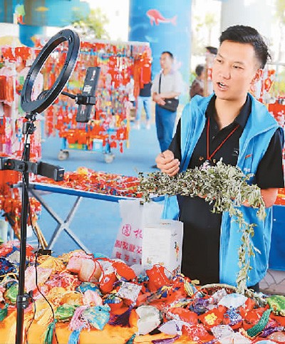 6月12日,在甘肅省隴南市武都區(qū)濱江公園,電商主播在直播銷售艾草等產(chǎn)品。