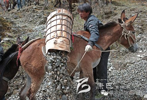 每天早上6點(diǎn)多,王玉海和同伴趕著騾子隊(duì),從白玉縣縣城旁邊的住地步行約1小時(shí)到達(dá)德沙村,約8開始從離索道橋約300米的路邊沙石場(chǎng)裝運(yùn)碎石。他們通常工作到下午5點(diǎn),每只騾子在海拔3000米左右的高度,來回運(yùn)送20次左右,每只騾子運(yùn)輸碎石大約在3000公斤左右。這些騾子正當(dāng)強(qiáng)壯年,年齡大約在三四歲,通常在坡度在30度以下的,最大負(fù)重約800斤。