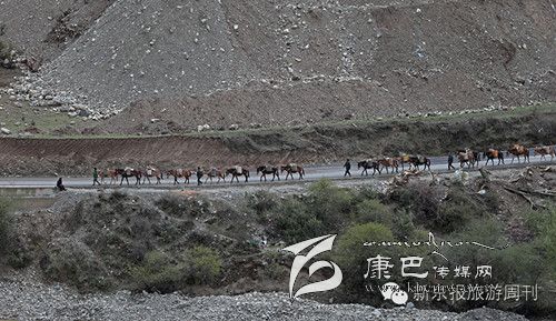 繼續(xù)通過白玉縣城的歐曲河。這是一條漫長的河流,和中國的母親河金沙江有不可分割的關(guān)系,騾子隊(duì)再次通歐曲河小心翼翼,王玉海嘴里念念有詞,走邊邊嘛,走邊邊嘛。不要再走已經(jīng)虛幻的中間地帶。我問王玉海,騾子能夠聽懂嗎。他說,真的,它能聽懂。