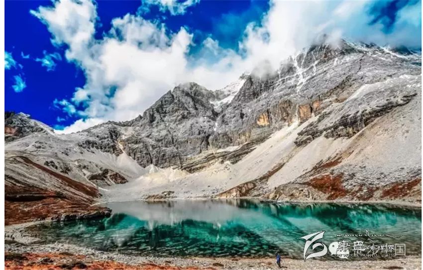 三神山中間的牛奶海,美麗的高原堰塞湖,面積0.5公頃,海拔4500米,四周雪山環(huán)繞,湖水清瑩碧藍(lán),山上成瀑,以其玲瓏秀雅水色翠藍(lán)而著名,牛奶海上方有大片的冰川。傳說(shuō)每年春暖花開(kāi)之時(shí),湖水會(huì)像牛奶一樣潔白如瓊漿,并因此得名牛奶海。