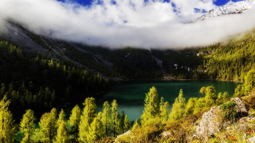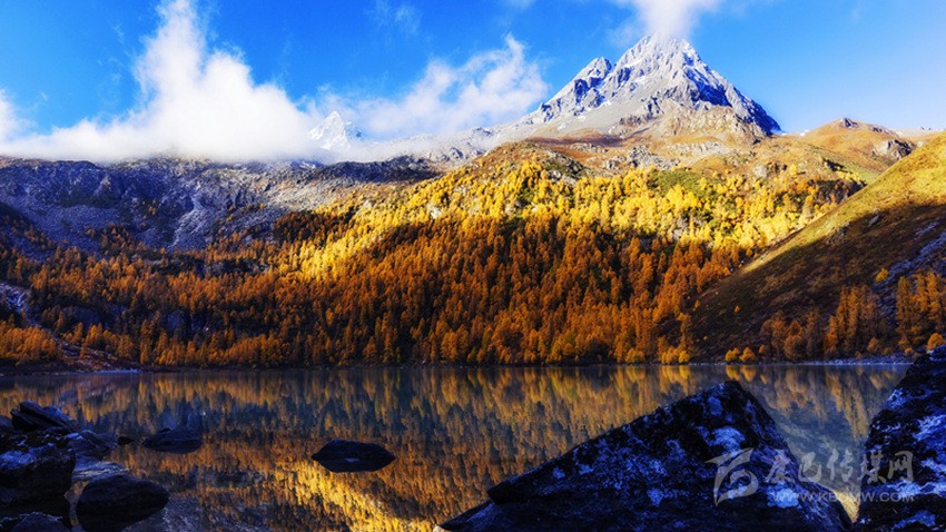 深秋季節(jié),騎馬上山,穿過彩色秋林來到湖邊,但見雪山腳下,層巒疊嶂,落葉松間,一池秋水像一顆純凈的寶石,鑲嵌在嶙峋陡峭的高山峽谷中,偎依在茂密的原始森林旁,湖水倒映著藍(lán)天白云和金黃的落葉松,靜謐而神秘,散發(fā)著迷人的光芒。這里沒有絲毫人工打造的痕跡,這里沒有一點(diǎn)人間煙火的味道,這里就是一方充滿誘惑的世外桃源——道孚甲依拉措。