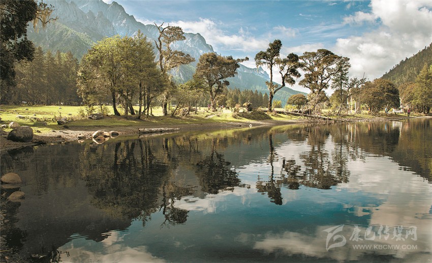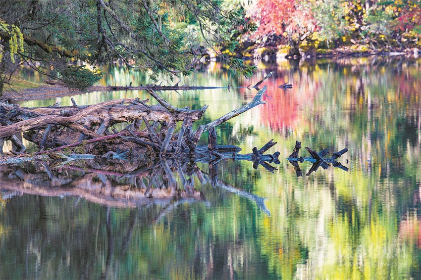 “江”與“湖”,靜臥于原始森林與草甸花海的之間,河溪清澈,湖水湛藍(lán),真如秘密花園,人間仙境。湖畔最美的是盤根錯節(jié)的老柏樹,枝條彎曲如蒼龍,或立于湖畔,或臥于湖中,滿湖樹影、花影隨風(fēng)搖曳。