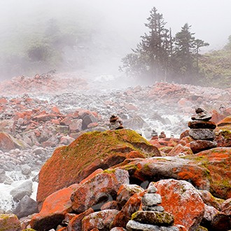 海螺溝的姊妹溝,位于海螺溝西北10 余公里的地方,周圍有15 座5000 米以上的高峰,從海拔2100 米逐次向上延伸至7556 米的貢嘎山主峰,目前還是一個鮮有人跡的地方。溝內(nèi)的景色原始自然,特有的紅石溝和奇溝內(nèi)的石頭千奇百怪,大面積的彩葉林帶更是秋天的寵兒。