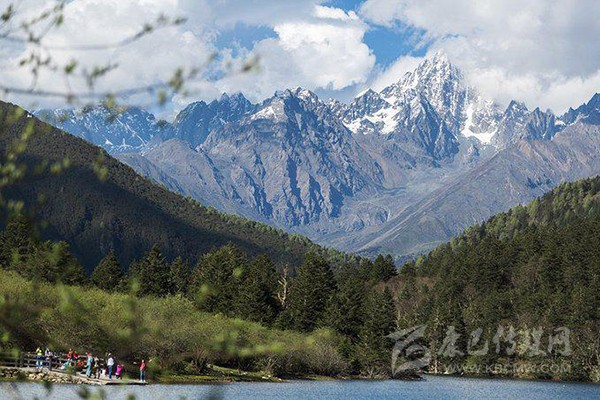 七色海左側(cè),碧空下雪峰挺拔,銀光閃爍,圣潔而神秘,其狀恰如觀音菩薩足下的蓮臺,故名蓮花山。據(jù)當?shù)夭孛裰v,一年之中只有三分之一時間蓮花山才露出來,不得不說,這次來木格措的運氣實在太好,蓮花雪山映襯著美麗的七色海,宛如一幅極美的高原畫卷。