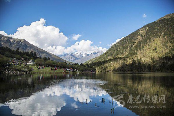 藥池沸泉一側(cè)是風景秀美的俄瑪錯,上頂藍天白云和雪山,下踏森林綠水,讓人透心舒暢。