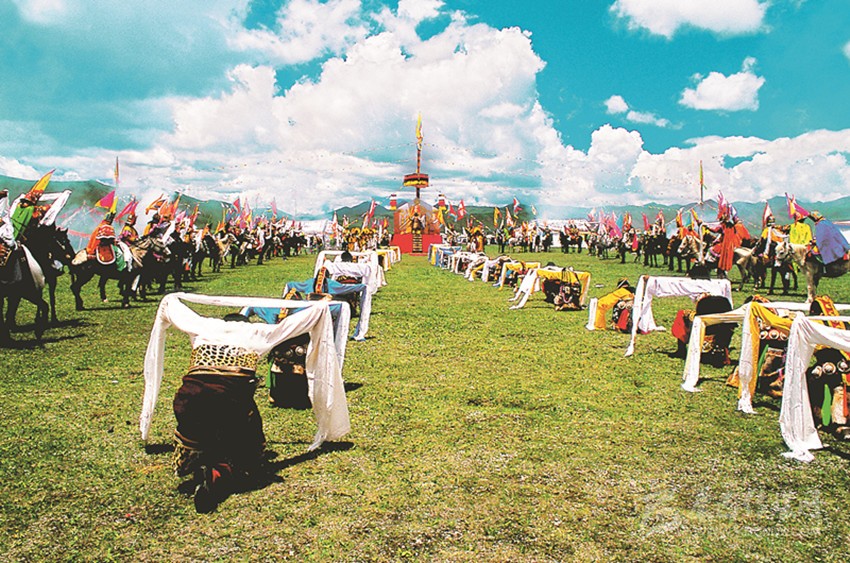 金馬草原以寬、平而著稱,藍天白云和雪山草地融為一體,明媚陽光和朵朵帳房風景如畫。傳說金馬草原腳下有一匹金馬,又傳說在這里曾發(fā)現(xiàn)過一塊馬頭形金塊,后人為祈禱福祉而得名,碧草連天,駿馬奔騰,千里沃野,牛羊成群。景區(qū)主要以草原風光和游牧部落風情為主,加上宗教文化的融入,使金馬草原旅游區(qū)成為集觀光、娛樂、探秘、朝拜、餐飲等于一體的景區(qū),游客不僅可以享受淳厚濃郁的民族風情,還可以體驗獨具特色的游牧部落文化。