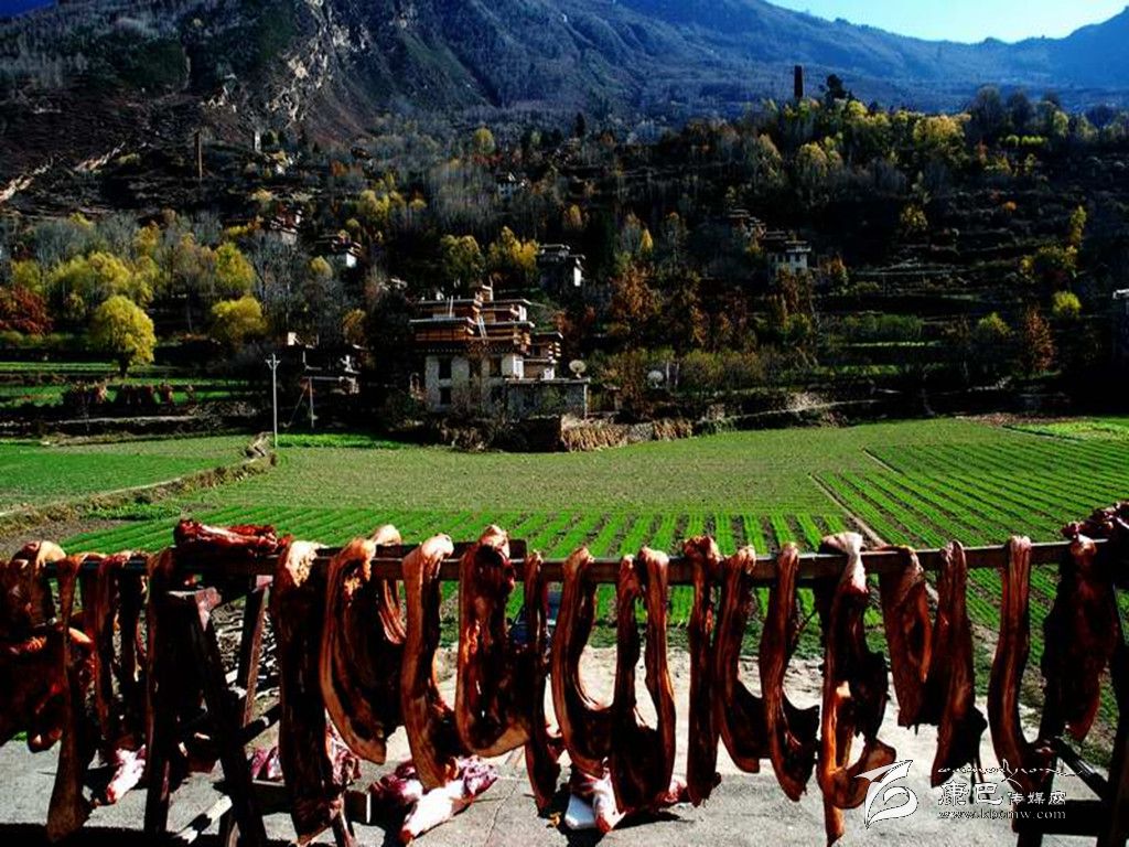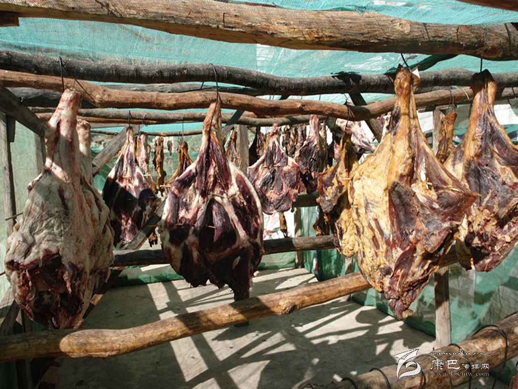 丹巴嘉絨藏族年期間,在酸菜包子、火燒饃、香豬腿等眾多的風味飲食中,“藏香豬腿”是必不可缺的美食佳肴,也是給長輩拜年和親朋好友間互送的最佳禮品。“藏香豬腿”的制作方式也象丹巴嘉絨藏族年一樣的獨特。丹巴人宰殺年豬的方式通常有用繩索死吊或者用刀從勁入殺心臟致死兩種,現(xiàn)在采用后一種方式宰殺豬居多。當?shù)厝藢⒇i宰殺后用熱水燙,處理好豬毛,再在胸口用刀開一孔,將手伸人胸腔扯斷心肺連接處,然后將其剖開,并把肥、瘦豬肉分離開,剝去板油,處理好其他內臟,將豬腿按原形分離,爾后經(jīng)霜凍、柏枝熏、自然風干后存放在儲藏室內。豬腿存放一冬后,色、香、味俱佳。食用時煮成半熟或用炭火將表皮烘烤,切成小塊狀或撕成粉絲狀,在百米內即可聞到香味,入口鮮嫩清香,營養(yǎng)豐富,誘人食欲。