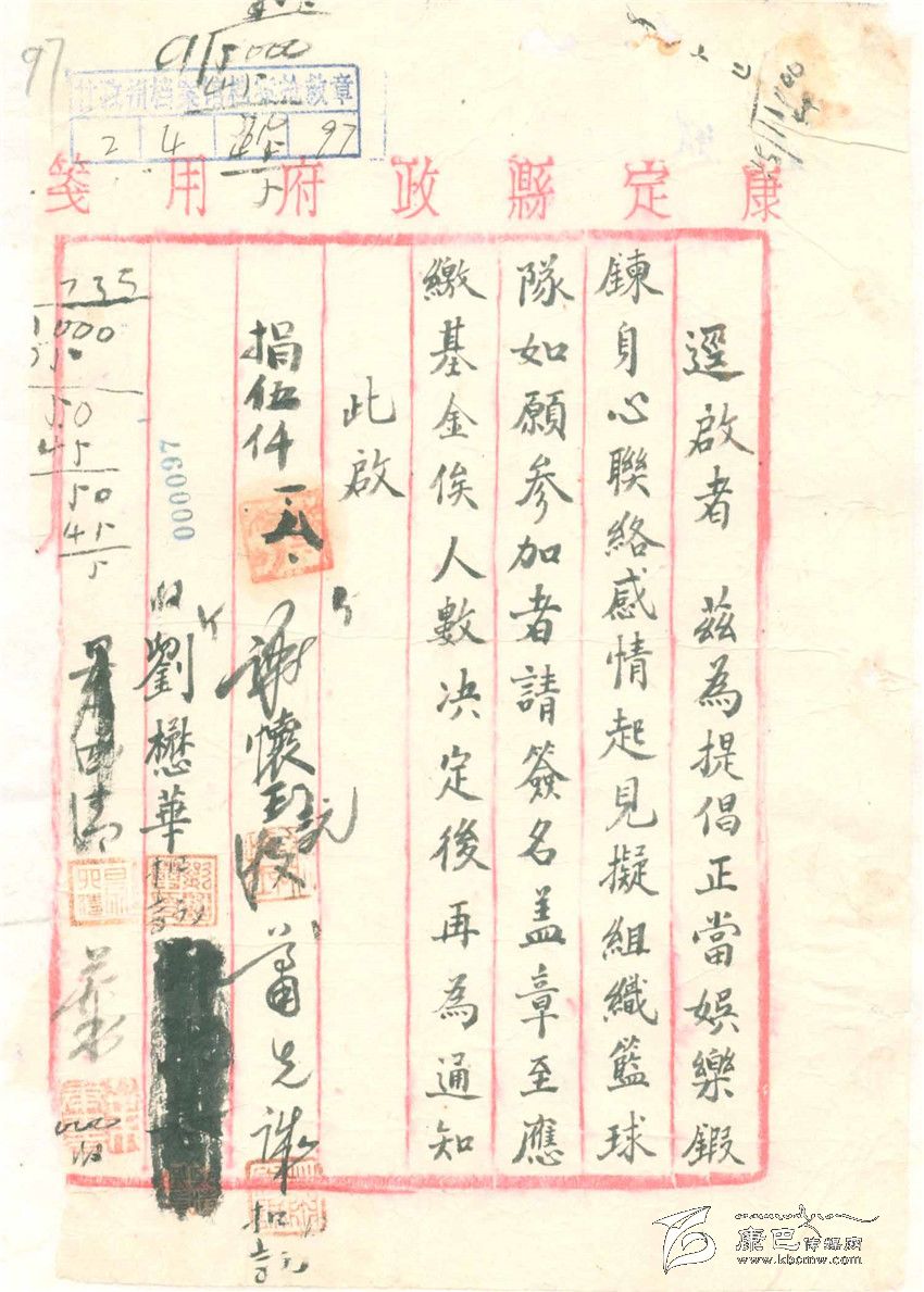 這是一張用解放前的康定縣政府便箋寫的“啟事”,內(nèi)容是倡議成立一支籃球隊。在上面簽字的有十多個人,這十多人一定是籃球運動的愛好者。至于這支籃球隊后來是不是成立等等都不見下文。而且,從這張“啟事”上看不到這件事發(fā)生在哪一年,只有一位名叫李培清的人寫下了收到捐款5700元、“三月三十日”的日期。最有意思的就是,在這張“啟事”上記下了的這句話:縣長捐購籃球款伍仟元。這句話起碼包涵了以下的意思,一,康定城里已經(jīng)興起了籃球運動;二,成立籃球隊沒有專門的經(jīng)費,幸好人們有很高的積極性,連縣長也主動捐款,那些簽名后面隱約可見的數(shù)字也可能是捐款的數(shù)字。