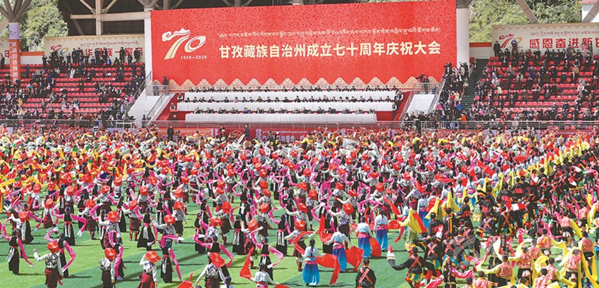 這一天,從康定東大門、南大門和北大門三個(gè)方向,不斷有馬隊(duì)排著長(zhǎng)隊(duì)進(jìn)入康定城——沿茶馬古道,以劉格平為團(tuán)長(zhǎng)的中央訪問(wèn)團(tuán),以及西康省委書記、省人民政府主席廖志高,軍區(qū)代司令方升普等領(lǐng)導(dǎo)同志一行在人民解放軍的保衛(wèi)下來(lái)了。他們是代表中央、中央人民政府、中央領(lǐng)導(dǎo)、西南局、西南軍政委員會(huì)、西康區(qū)黨委和西康省人民政府向康區(qū)各族人民、全體干部和解放軍指戰(zhàn)員表示慰問(wèn)和祝賀的;他們向自治區(qū)人民政府帶來(lái)了毛澤東主席題詞“中華人民共和國(guó)各族人民團(tuán)結(jié)起來(lái)”的錦旗,以及劉伯承、賀龍、鄧小平同志贈(zèng)送的“團(tuán)結(jié)各兄弟民族共同建設(shè)新西南并鞏固西陲國(guó)防”的錦旗。