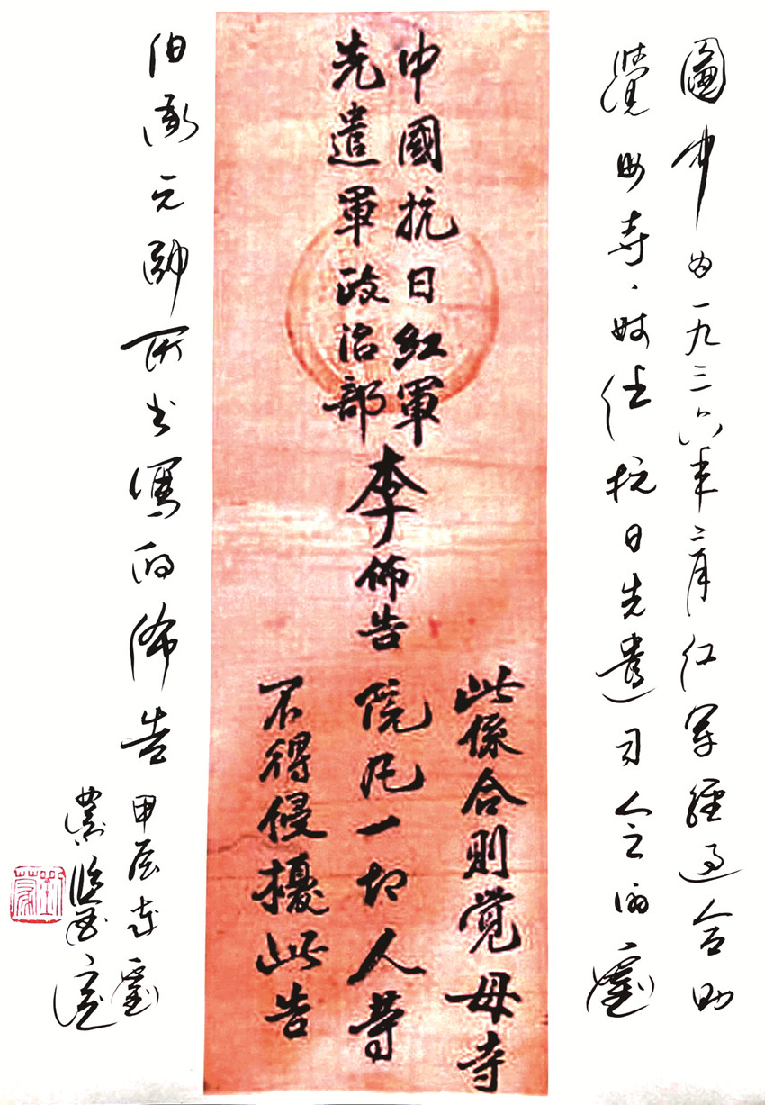 1936年2月,為執(zhí)行紅軍總部的《康道爐戰(zhàn)役計(jì)劃》,以劉伯承為中國抗日紅軍先遣軍司令員的紅30軍從雅安寶興翻越夾金山西進(jìn),經(jīng)懋功、金湯、丹巴,攻取道孚、爐霍、甘孜地區(qū)。3月1日,紅30軍攻占道孚,25日,攻占爐霍,30日進(jìn)駐甘孜縣。紅30軍來到甘孜縣合則覺母寺院附近,為打開當(dāng)?shù)氐木置妫t軍堅(jiān)決執(zhí)行紀(jì)律,不干擾百姓。中國抗日紅軍先遣軍政治部以軍政委李先念的名義,頒布了保護(hù)覺母寺(尼姑庵)的布告。布告說“此系合則覺母寺院,凡一切人等不得侵?jǐn)_,此告”。