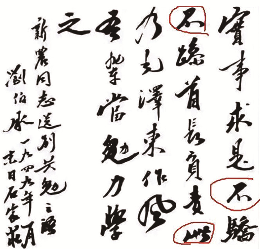 以上是劉帥1949年的書法,距離1936年13年的時(shí)間,“不” “此”二字,明顯與布告上的風(fēng)格一致。國、合、軍等單個的字,在建國后的書法作品與布告比較,都可以在劉帥其他書法中看到明顯出自一人。
