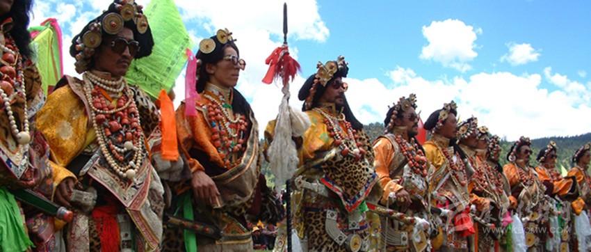 同時(shí),因?yàn)榭蛋筒貐^(qū)雪峰林立,氣候寒冷。以號(hào)稱地球第三極地聞名遐邇。康巴人民世世代代就在這世界屋脊上過著“逐水草而居”的游牧和半牧半農(nóng)的生活。因而在服飾上也形成了具有典型的雪域高原民族獨(dú)有的地方風(fēng)格特色??傮w呈現(xiàn)出寬大粗獷、英武健美、豪氣颯爽的特點(diǎn)和大襟、寬腰、長袖、超長、無扣的特征。而色彩是康巴藏族服飾點(diǎn)綴美的靈魂,他們?cè)谏蔬\(yùn)用上十分著重色塊與整體的相襯與和諧,其運(yùn)用最多的紅、黃、藍(lán)、綠、白、黑,往往包含了宗教的象征意蘊(yùn),又歸納了雪域大自然所呈現(xiàn)的直觀表征:他們認(rèn)為藍(lán)、白、綠、紅、黃五彩是菩薩的服裝,藍(lán)色代表藍(lán)天,白色表示白云,綠色表示河流,紅色表示空間護(hù)法神,黃色表示大地。這是康巴人貼近自然的感恩之情和神性世界的精神延續(xù)的又一直接表達(dá)。
