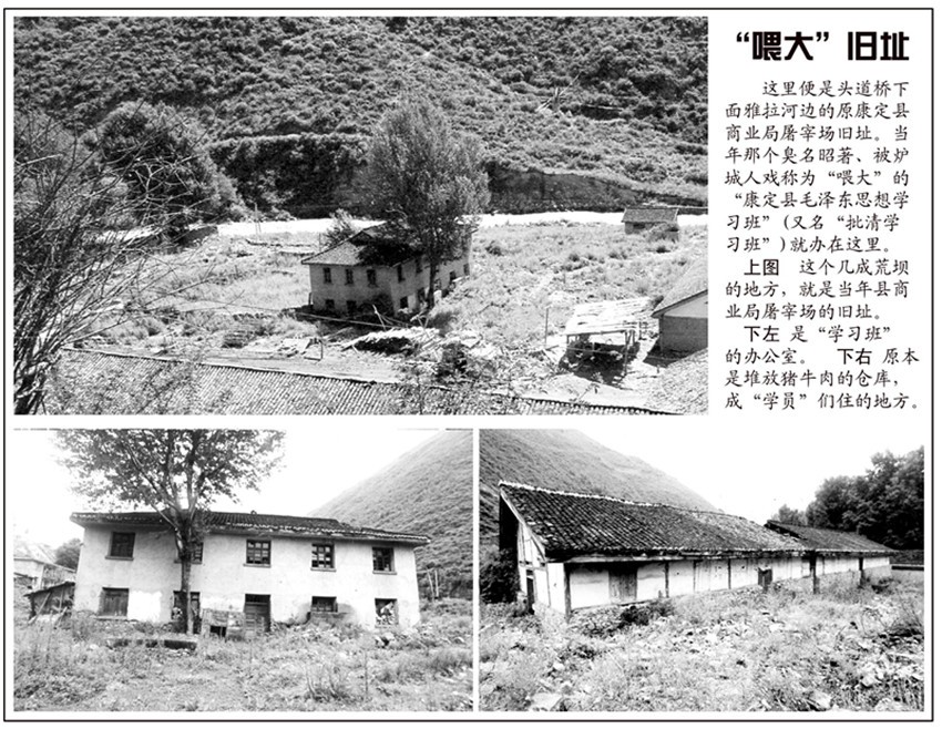 當(dāng)年康定縣搞“一批雙清”,特地選在雅拉河邊上康定縣商業(yè)局的屠宰場辦了個以“催肥”為目標(biāo)之一的“學(xué)習(xí)班”,其意就是要在這里將一些“不夠秤”的“5.16”“三老會”對象,“一批二斗”擠“材料”,像屠宰場催肥豬一樣“展”夠秤。所以爐城人將它戲稱為“喂大”。