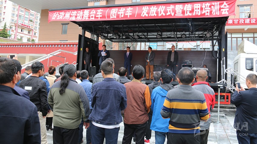 本網(wǎng)訊(記者 宋志勇 文/圖)6月22日,我州流動(dòng)舞臺(tái)車(圖書車)發(fā)放儀式暨使用培訓(xùn)會(huì)在康定舉行,旨在為全州13個(gè)縣(市)及州歌舞團(tuán)、州圖書館統(tǒng)一配發(fā)流動(dòng)舞臺(tái)車、圖書車,著力解決基層群眾看文藝演出難、看圖書難以及文藝表演團(tuán)體下鄉(xiāng)演出搭臺(tái)難、轉(zhuǎn)點(diǎn)難等實(shí)際困難,進(jìn)一步豐富基層農(nóng)牧民群眾文化生活。這是繼全國(guó)文化信息資源共享、鄉(xiāng)鎮(zhèn)綜合文化站建設(shè)實(shí)施的又一文化惠民工程。
