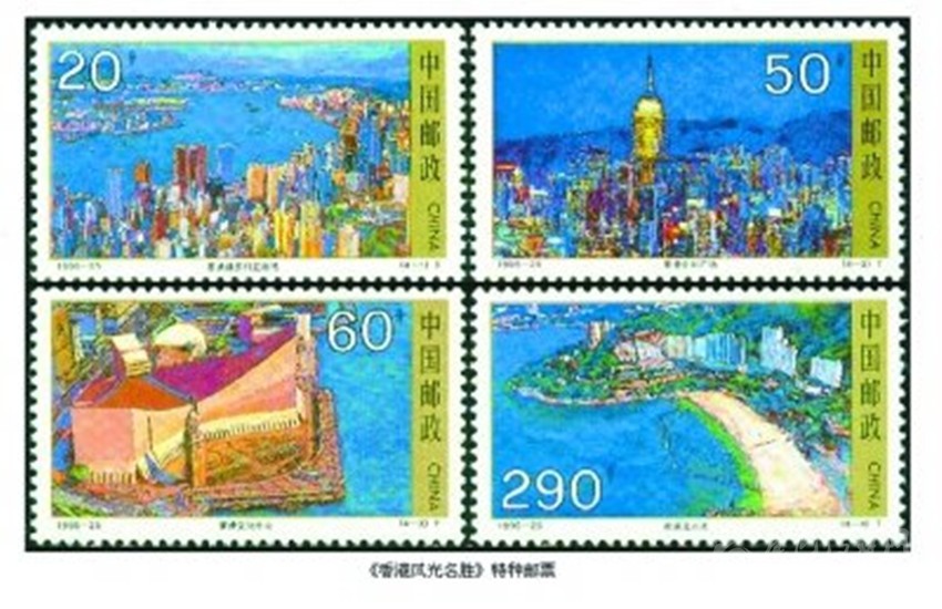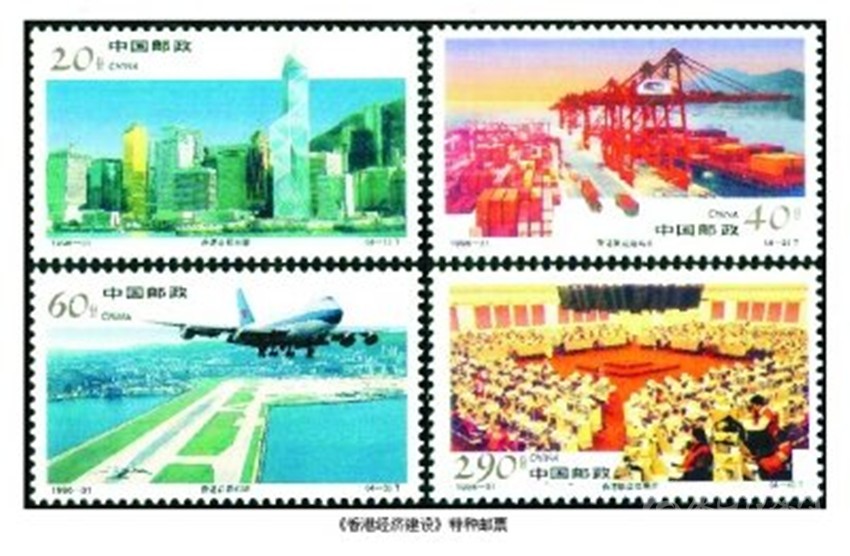 在香港回歸祖國的進程中,為了讓全國和世界人民認識香港,了解香港,我國相繼發(fā)行了兩套介紹香港風光名勝和經(jīng)濟建設的特種郵票。1995年11月28日,我國發(fā)行《香港風光名勝》特種郵票,全套4枚。圖案分別為“維多利亞港灣”“中環(huán)廣場”“文化中心”和“淺水灣”;1996年12月19日發(fā)行《香港經(jīng)濟建設》特種郵票,全套4枚。圖案分別為“香港中銀大廈”“香港集裝箱碼頭”“香港啟德機場”和“香港聯(lián)合交易所”。