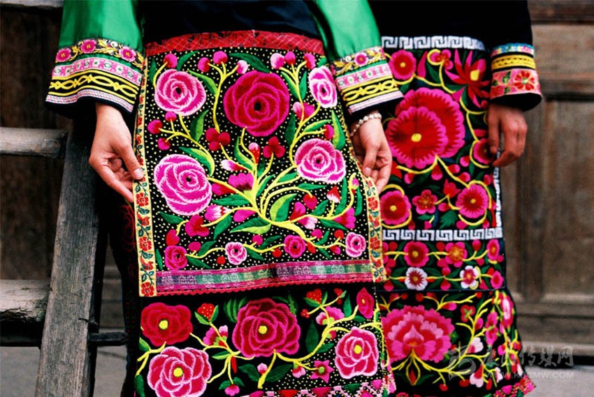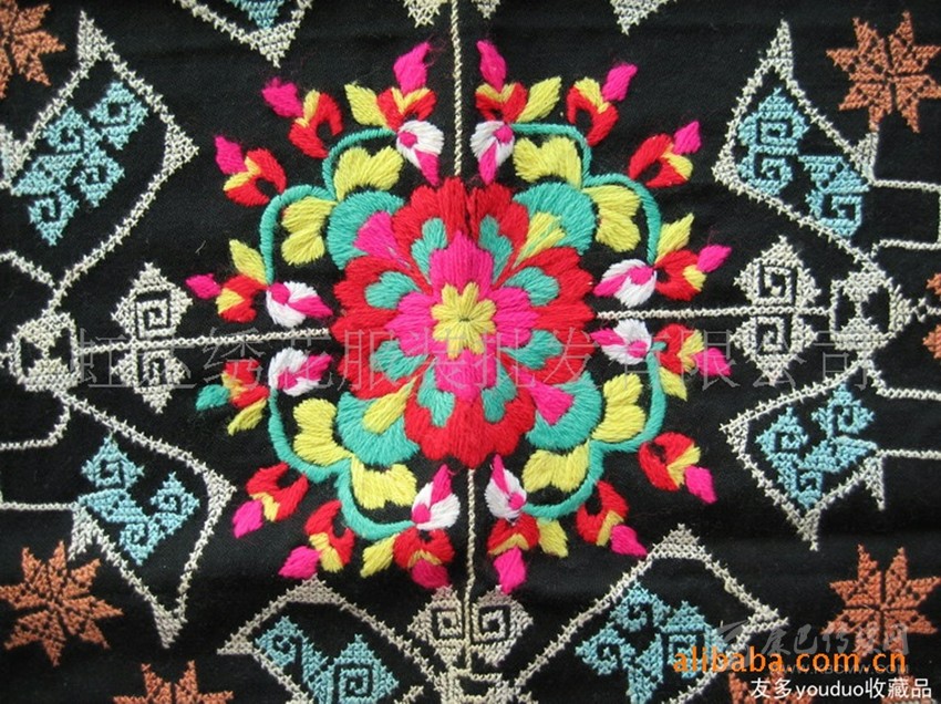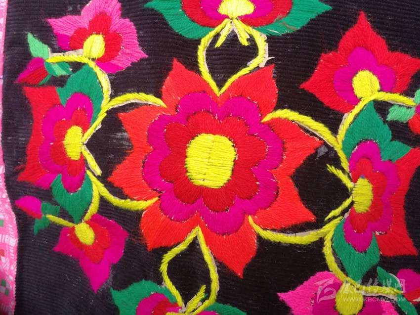 在這里,婦女們猶愛花草。所以,他們的刺繡作品,有生活的細(xì)節(jié)滲透,如氣息,若有似無,相互浸潤。無論是花蔓纏枝,還是朵花團(tuán)簇,都從生活中提煉,視之便信手拈來,放在青布黑衫之上,鮮艷奪目,張顯著生活在這方水土之上,人們獨(dú)特的審美情趣。