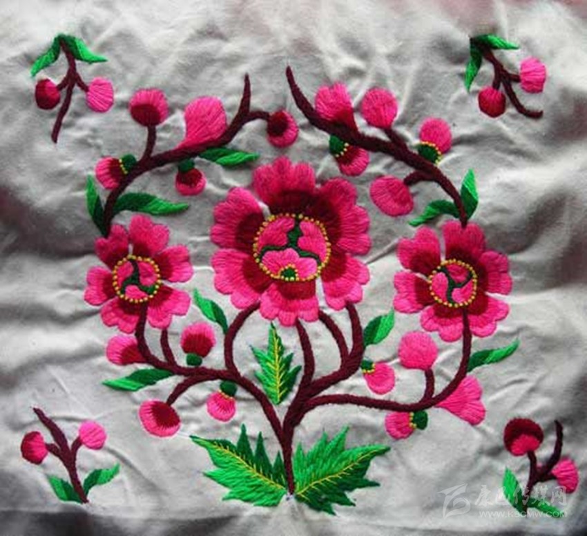 在魚通,刺繡以花朵為主。會(huì)繡花的女人,被稱為“花匠”。“小花匠”們從十多歲就開始接觸刺繡,通過年長者口傳身授,自學(xué)的方式成為一代繡女。稚嫩的雙手,再經(jīng)過時(shí)間的洗禮,刺繡的技巧早已爛熟于心,在心的指引下,穿針引線,針尖如麥芒,各色陪底線來回,穿梭于布料的經(jīng)緯之間。買回青布,從下手的第一針開始,整幅圖的構(gòu)架便了然于心,各式花朵圖案成竹在胸,線條在暗自游走,勾勒越來越清晰。每一次的飛針走線,是婦人手上的一針針,一線線,都在為作品最后的完美收關(guān),錦上添花,做著必不可少的鋪墊。