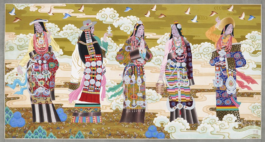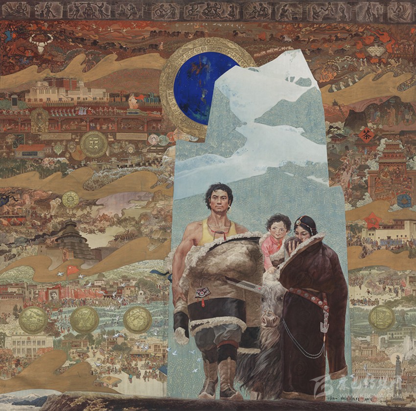 青藏高原有著曠遠(yuǎn)弘大的人文地理,有著神秘久遠(yuǎn)的宗教文化傳承,正是這蒼茫大地孕育了藏族人;正是這片極度追求審美體驗(yàn)并把生活高度藝術(shù)化的疆域,滋養(yǎng)了西藏藝術(shù)。從早期的巖畫、旗幡畫、唐卡、壁畫,再到當(dāng)代的丹青重彩,無不生發(fā)于這片神奇高原,皆是中華民族文化寶庫中燦爛的牟尼寶珠。唐卡繪畫肇啟于松贊干布隆興之時(shí),向南學(xué)習(xí)印度、尼泊爾布畫,往西受到犍陀羅藝術(shù)浸潤,向東融合唐、宋、明、清之審美,再集藏地宗教文化、民族審美熔為一爐,鑄就一千三百年唐卡繪畫之法脈。它不僅是獨(dú)具魅力的藏文化之血脈源流,更是各民族文化交融、和諧互生的典范,對世界藝術(shù)有著深遠(yuǎn)的影響。