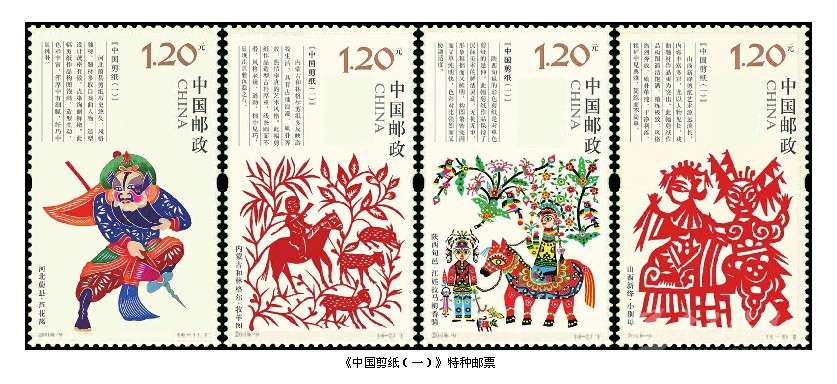 2018年1月24日,中國郵政發(fā)行《中國剪紙(第一組)》特種郵票,全套4枚。這是中國郵政繼1959年1月1日發(fā)行的《剪紙》特種郵票59年后重新發(fā)行的《中國剪紙》系列郵票。全系列郵票計劃發(fā)行4組,每組4枚。這次發(fā)行的第一組4枚郵票入選內(nèi)容分別是被列入第一批國家級非物質(zhì)文化遺產(chǎn)名錄的北方四處剪紙傳承人的作品:第一枚“河北蔚縣·蘆花蕩”,河北蔚縣剪紙歷史悠久,風(fēng)格獨特,題材多取自于人物,造型設(shè)計疏密有致,點染絢麗鮮艷。此幅作品作者王老賞(1890-1951),河北省蔚縣南張莊村人;第二枚“內(nèi)蒙和林格爾·牧羊圖”,內(nèi)蒙古和林格爾剪紙多反映游牧生活,具有古拙浪漫、質(zhì)樸奔放、熱情率真的藝術(shù)風(fēng)格。此幅作品作者張花女 (1903-2004),和林格爾縣董家營鄉(xiāng)曹老八夭村人;第三枚“陜西旬邑·江娃拉馬梅香騎”,陜西旬邑的彩色剪紙具有民間美術(shù)的鮮活靈動,無拘無束,形象稚拙而又鮮明,構(gòu)圖緊密完滿而又單純明快,色彩對比強(qiáng)烈而又協(xié)調(diào)適度。此幅作品作者庫淑蘭(1920-2004),陜西咸陽市旬邑縣張洪鎮(zhèn)赤道鄉(xiāng)富村人;第四枚“山西新絳·小別母”,山西新絳剪紙藝術(shù)源遠(yuǎn)流長,內(nèi)容豐富多彩,尤以人物見長,戲曲題材作品更為突出,構(gòu)圖簡潔飽滿、精煉極致,粗獷中見典雅,簡煉而不簡單。此幅作品作者蘇蘭花(1906-1995),山西運城市新絳縣澤掌鎮(zhèn)北蘇村人。