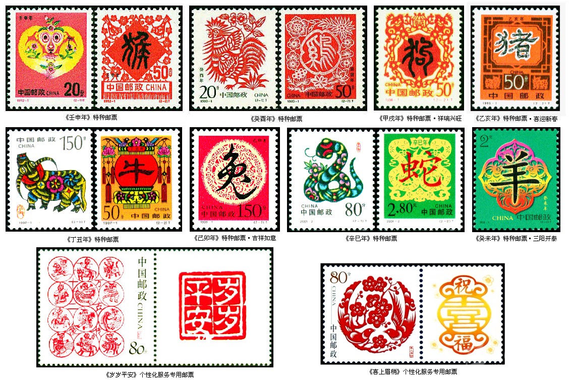 剪紙作為藝術(shù)百花園中的一朵奇葩,在我國郵票圖案設(shè)計中應(yīng)用也非常廣泛。由于傳統(tǒng)的民間剪紙有著濃郁的吉祥喜慶氣氛,因此在我國近些年發(fā)行的生肖郵票中多次出現(xiàn)剪紙藝術(shù)。在第二輪12套24枚生肖郵票中的剪紙圖案分別有1992年《壬申年》的“猴桃獻(xiàn)瑞”和“喜鵲登梅”、1993年《癸酉年》的“雄雞報曉”和“四季吉祥”、1994年《甲戌年》的第二枚“祥瑞興旺”、1995年的《乙亥年》的第二枚“喜迎新春”、1997年的《丁丑年》的“金牛奮蹄”和“牛耕年豐”、1999年《己卯年》的第二枚“吉祥如意”、 2001年《辛巳年》的“祥蛇祝?!焙汀跋檫\普照”以及2003年的《癸未年》第二枚“三陽開泰”等。這些郵票中剪紙圖案有的直接取材于民間,有的則是在原作基礎(chǔ)上再創(chuàng)作。如“雄雞報曉”一枚,圖案選用的是河北省獻(xiàn)縣本齋鄉(xiāng)鄧家莊蔡蘭英老人的剪紙“百雞圖”中的一幅,而“金牛奮蹄”一枚,圖案是根據(jù)山東高密民間藝人齊秀花的剪紙“媳婦騎?!痹偌庸?chuàng)作而成的。在我國發(fā)行的祝福系列個性化服務(wù)專用郵票中也有吉祥喜慶的剪紙圖案,即2005年11月6日的《歲歲平安》和2005年11月11日的《喜上眉梢》等。