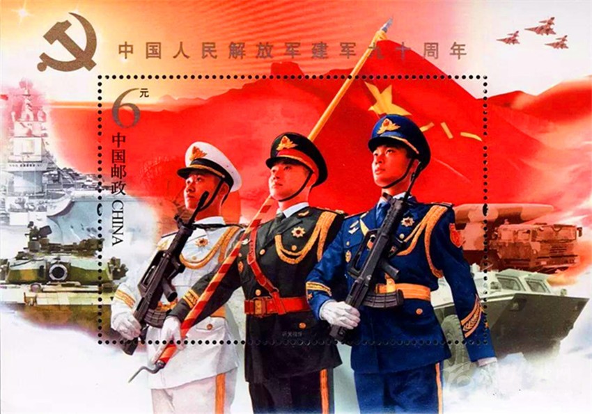 2017年8月1日,中國郵政發(fā)行《中國人民解放軍建軍九十周年》紀(jì)念郵票小型張“聽黨指揮”(圖8)。郵票畫面上“八一”軍旗飄揚,各軍種英姿颯爽,背景襯托各軍種高尖端裝備,描繪了我軍戰(zhàn)士聯(lián)合作戰(zhàn)的畫面,既表現(xiàn)了中國人民解放軍威武雄壯的軍容和現(xiàn)代化水平,也表現(xiàn)了在黨的指揮下,人民軍隊忠實履行保衛(wèi)祖國、捍衛(wèi)和平的神圣使命。